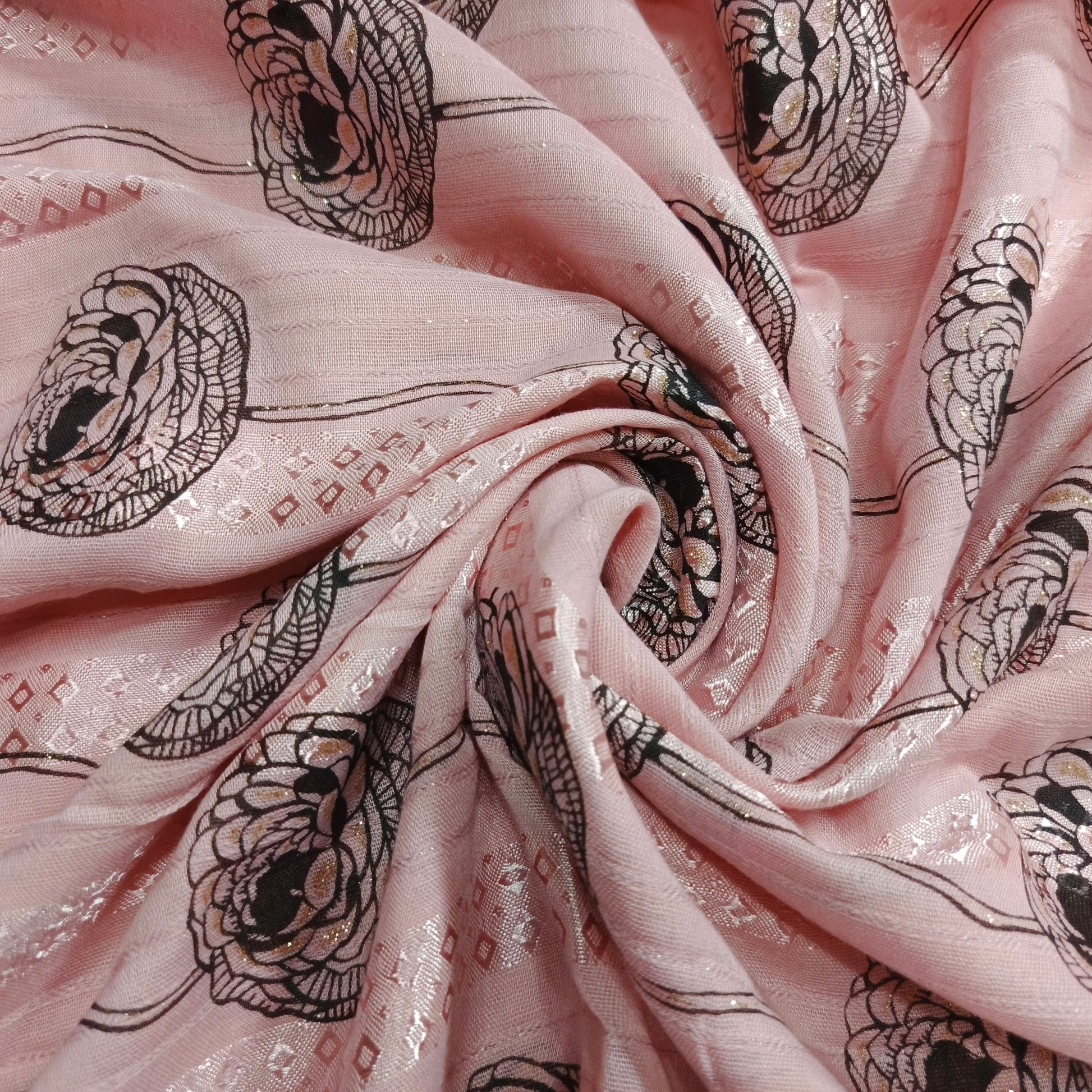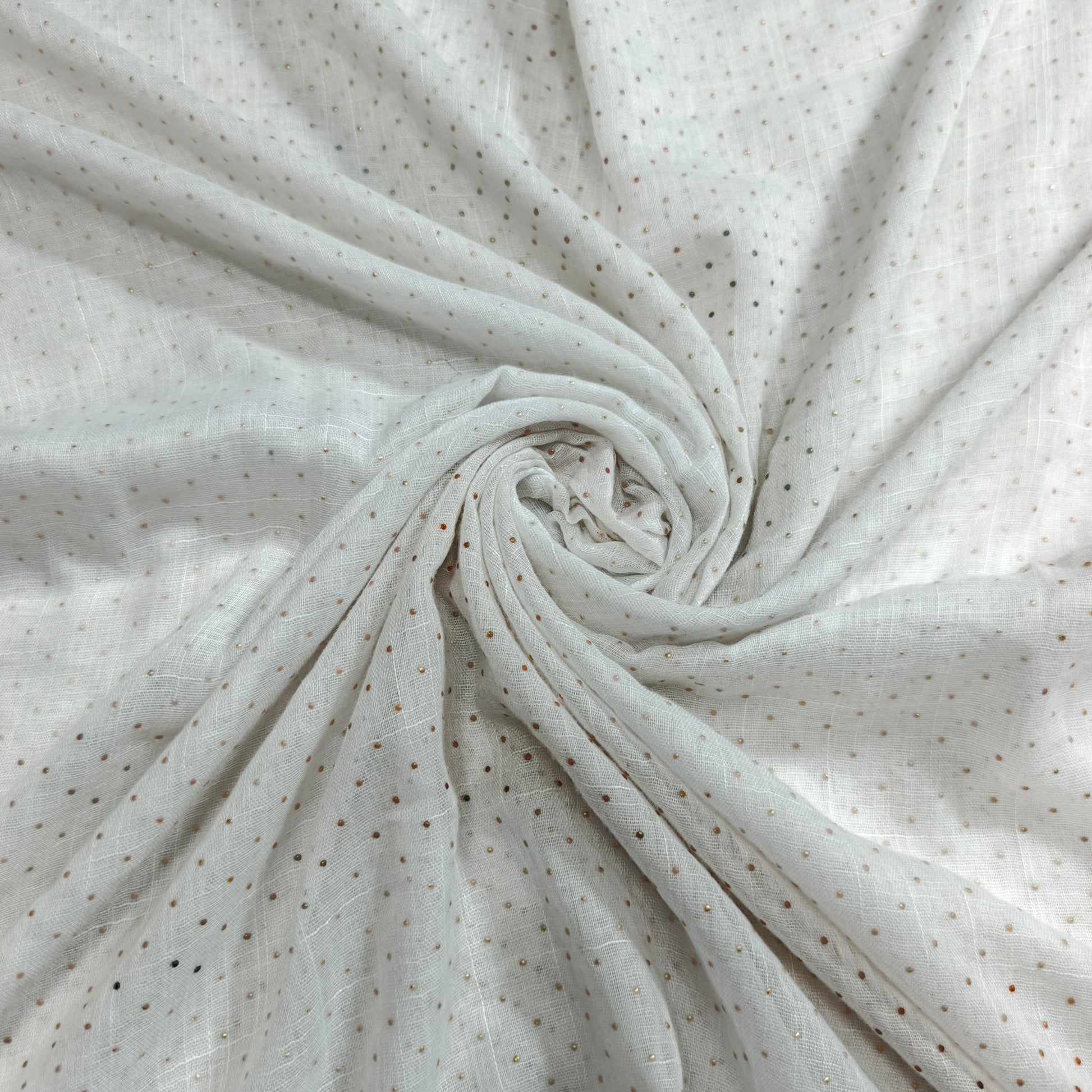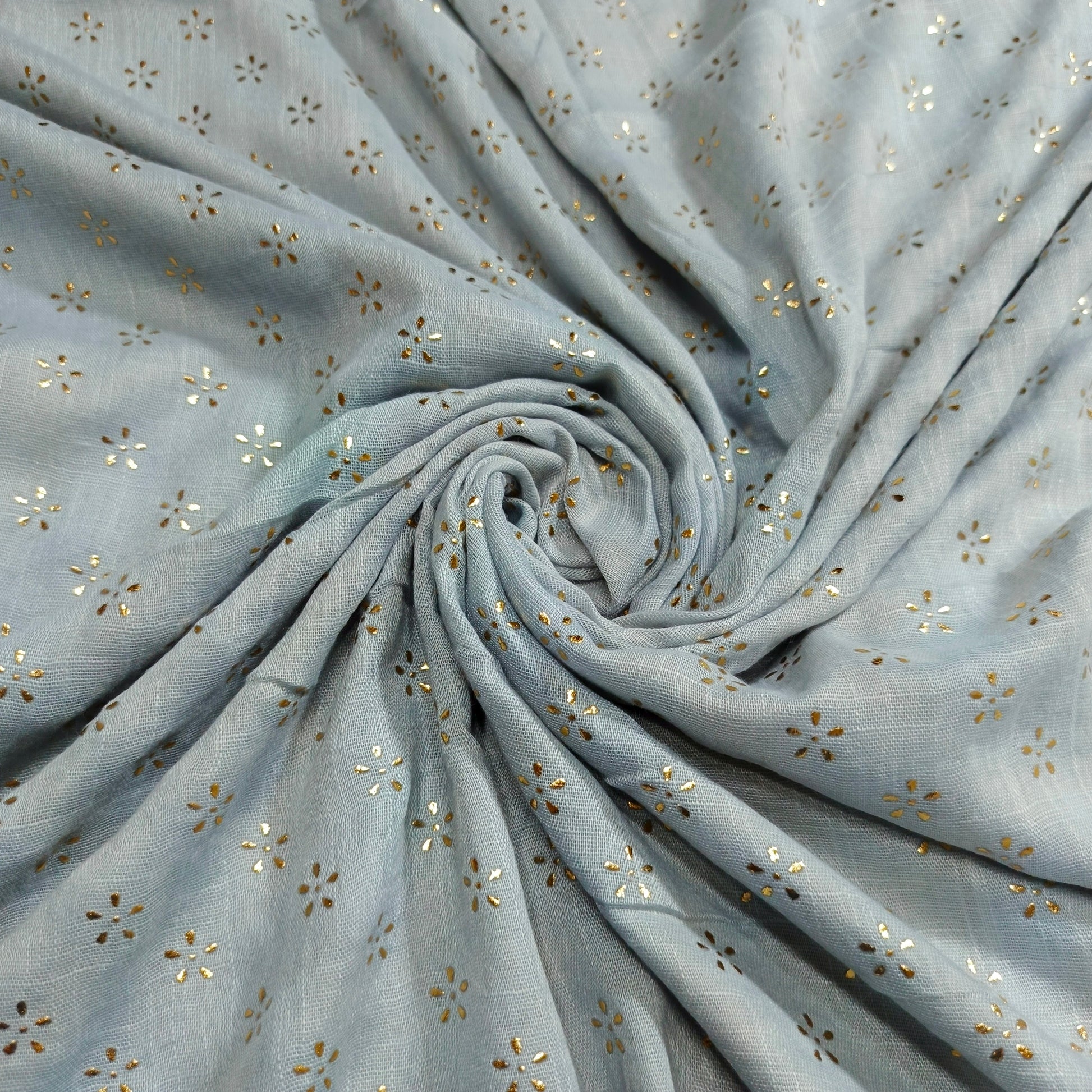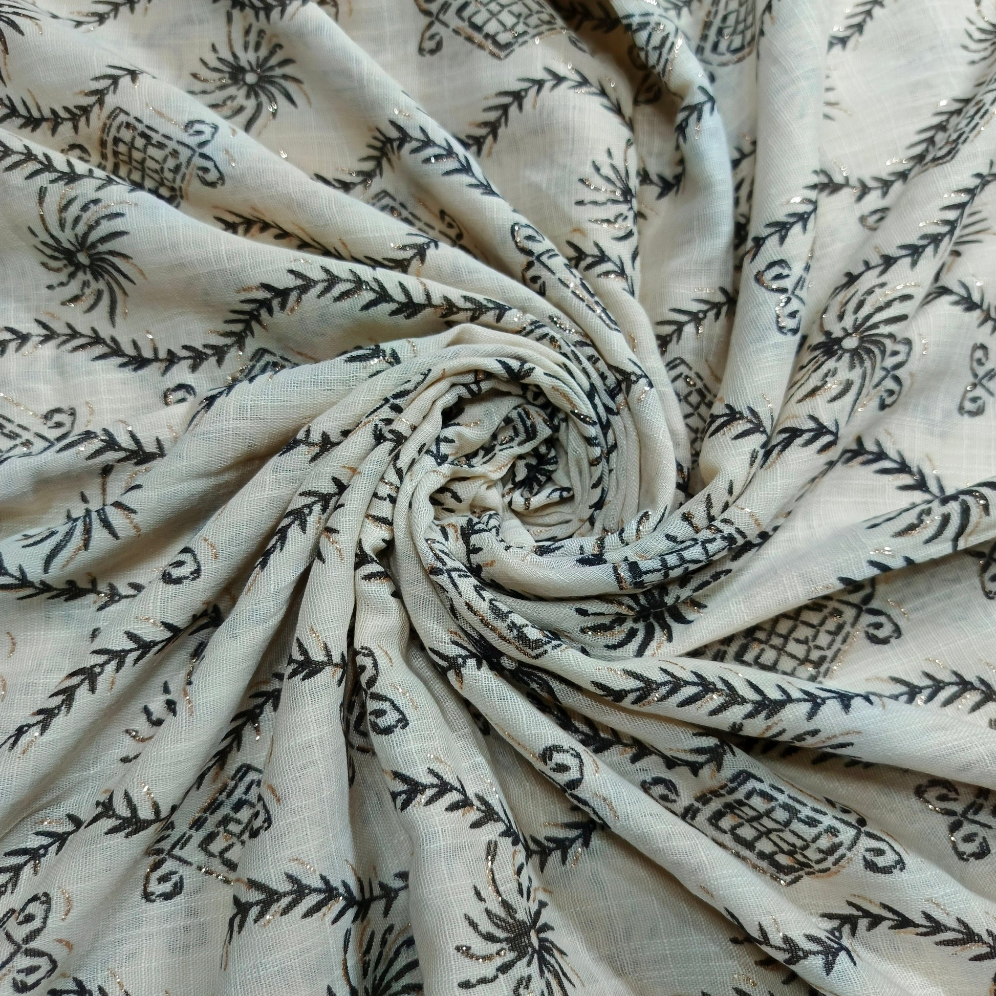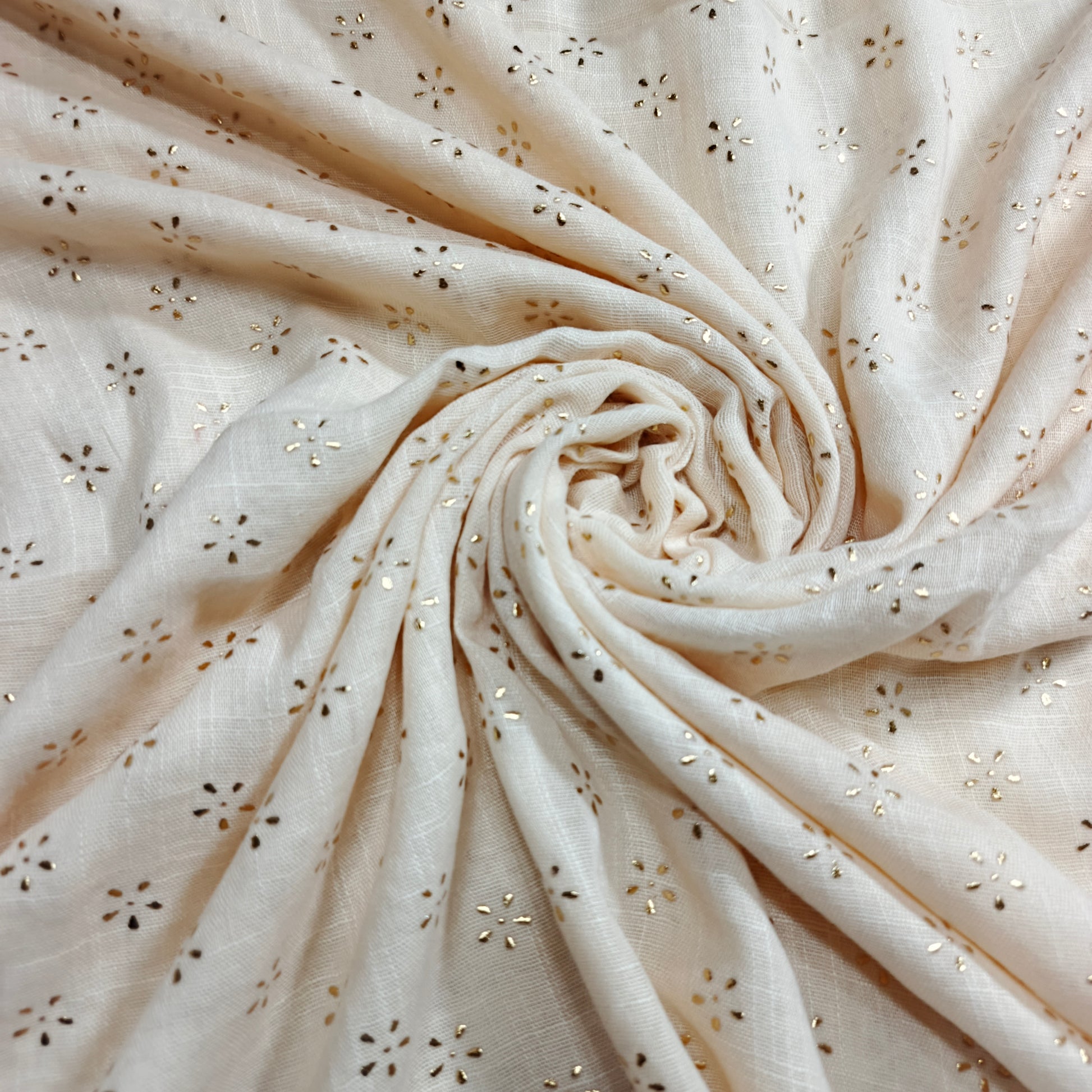 Capture attention with the dazzling shimmer of our Lawn Foiled Work fabric. This fabric features precisely applied foil accents on a lightweight lawn base, creating a captivating interplay of light and texture.