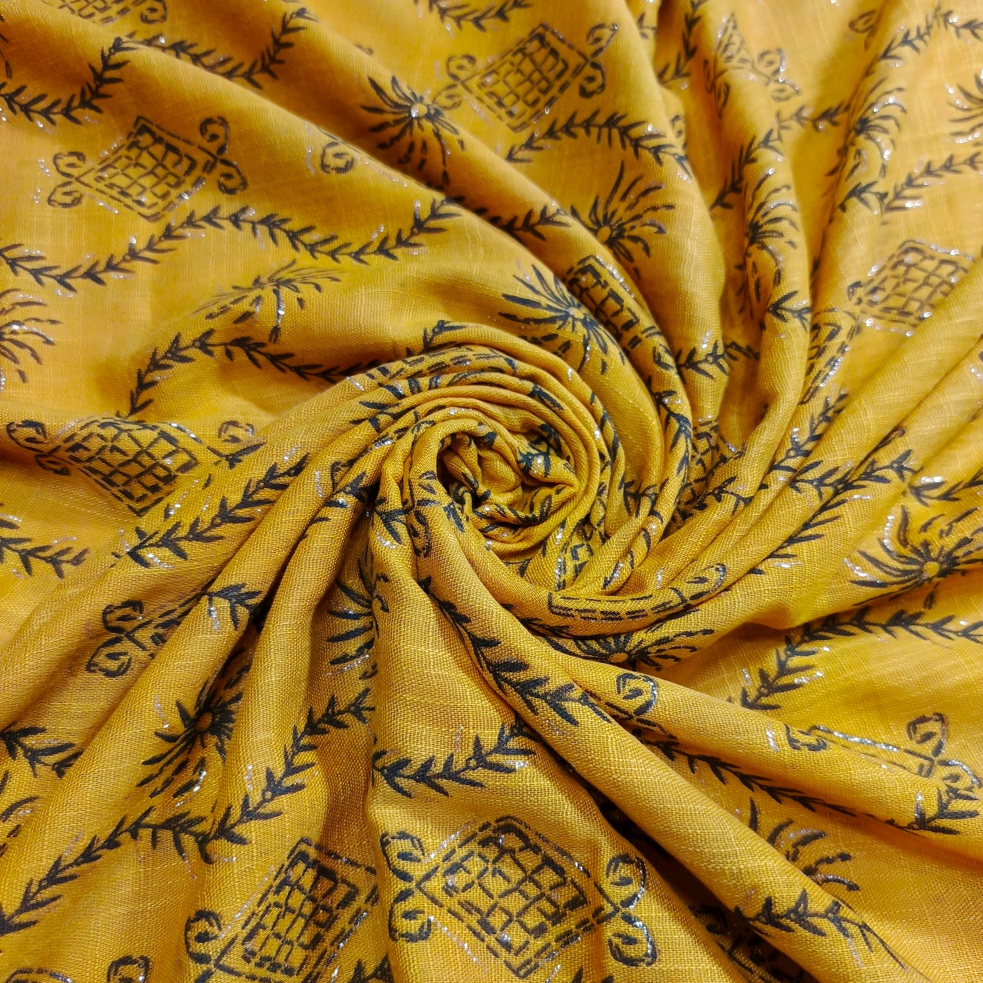 - Textural Contrast: The smooth lawn complements the shimmering foil, adding depth to the fabric.